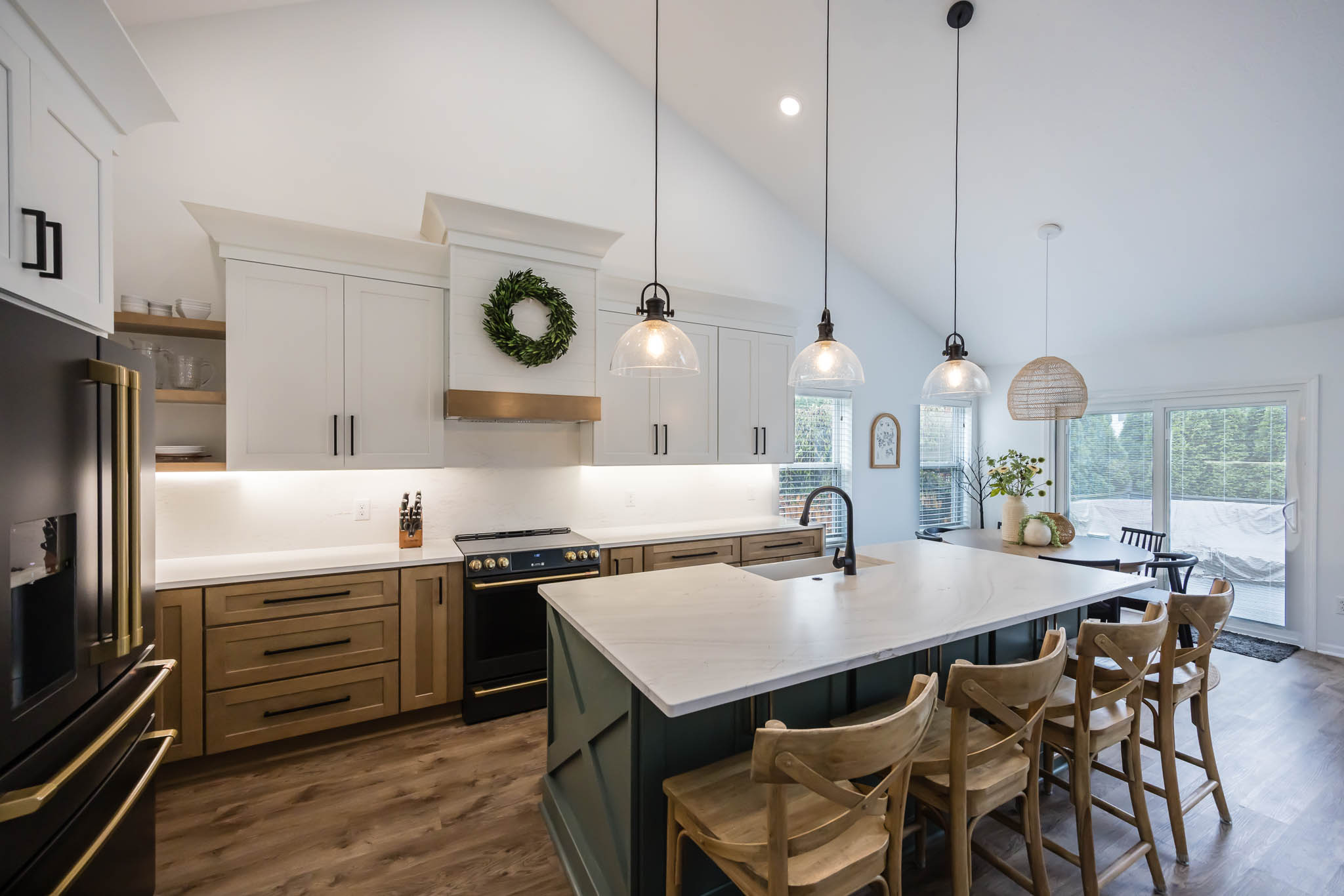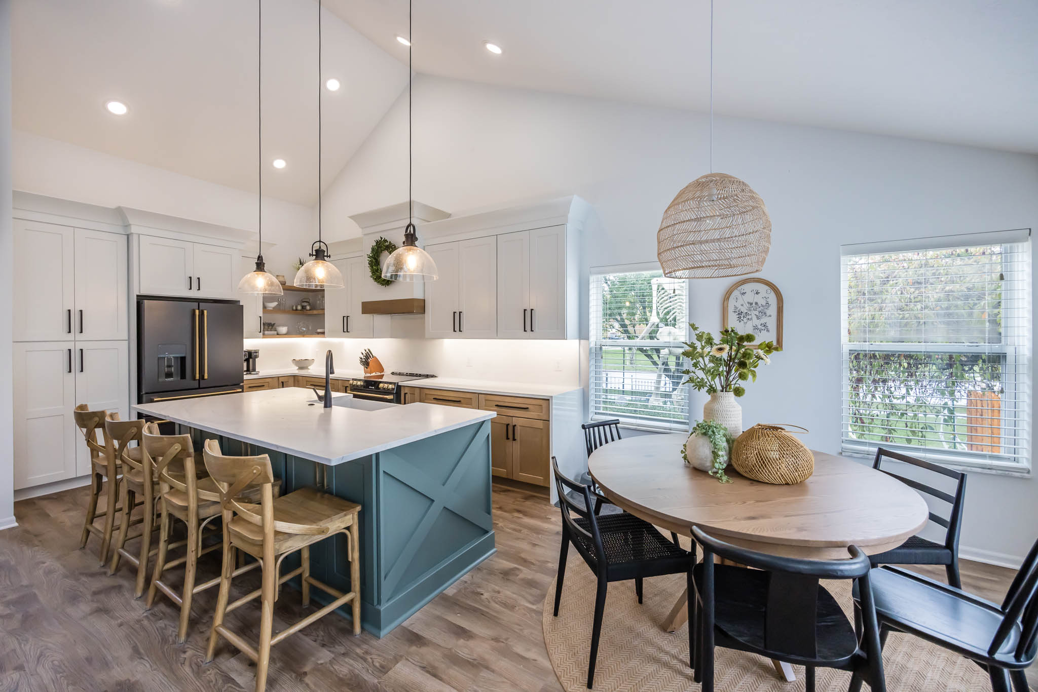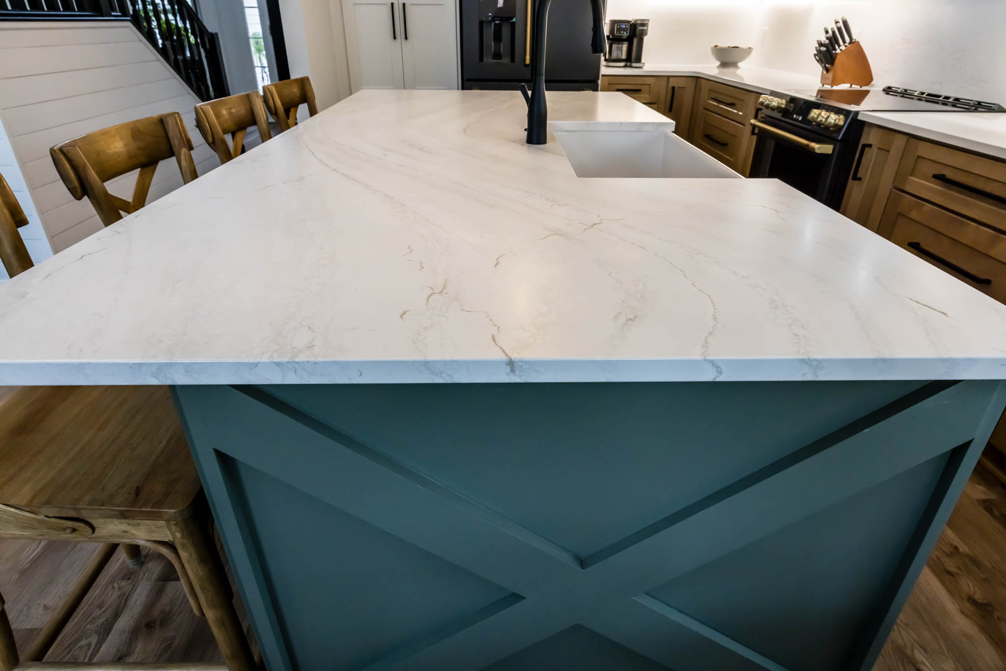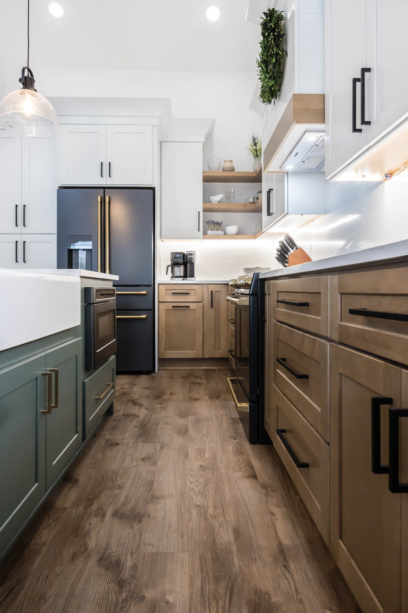 This kitchen was designed using modern color schemes, with a clean wood finish on the lower cabinetry, and then a a sleek smooth white on the uppers. The island is a teal color that pops, making the kitchen feel fun and exciting, but also sleek and modern.