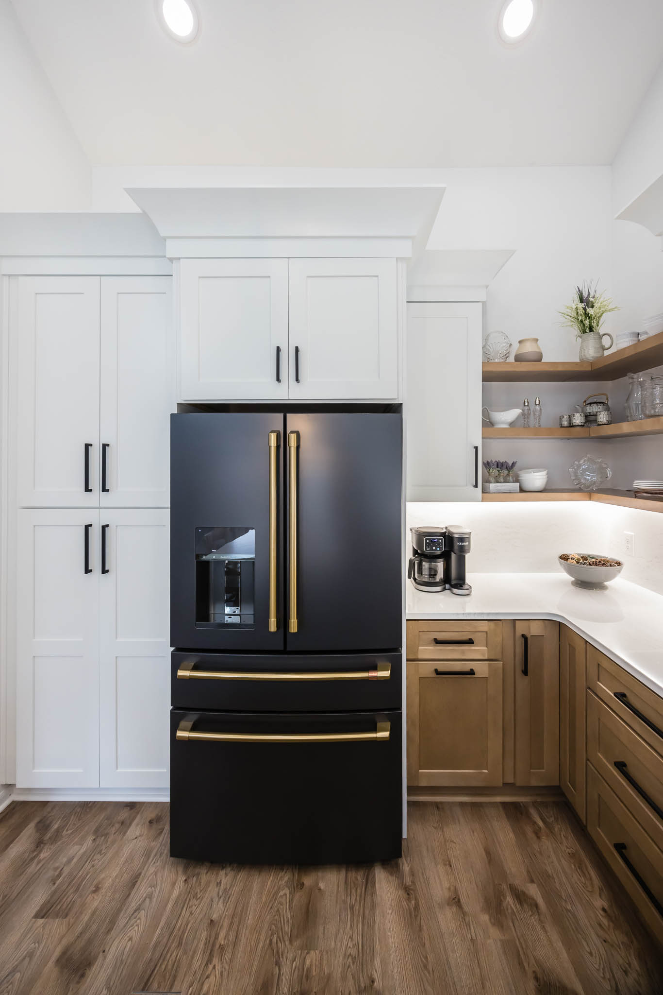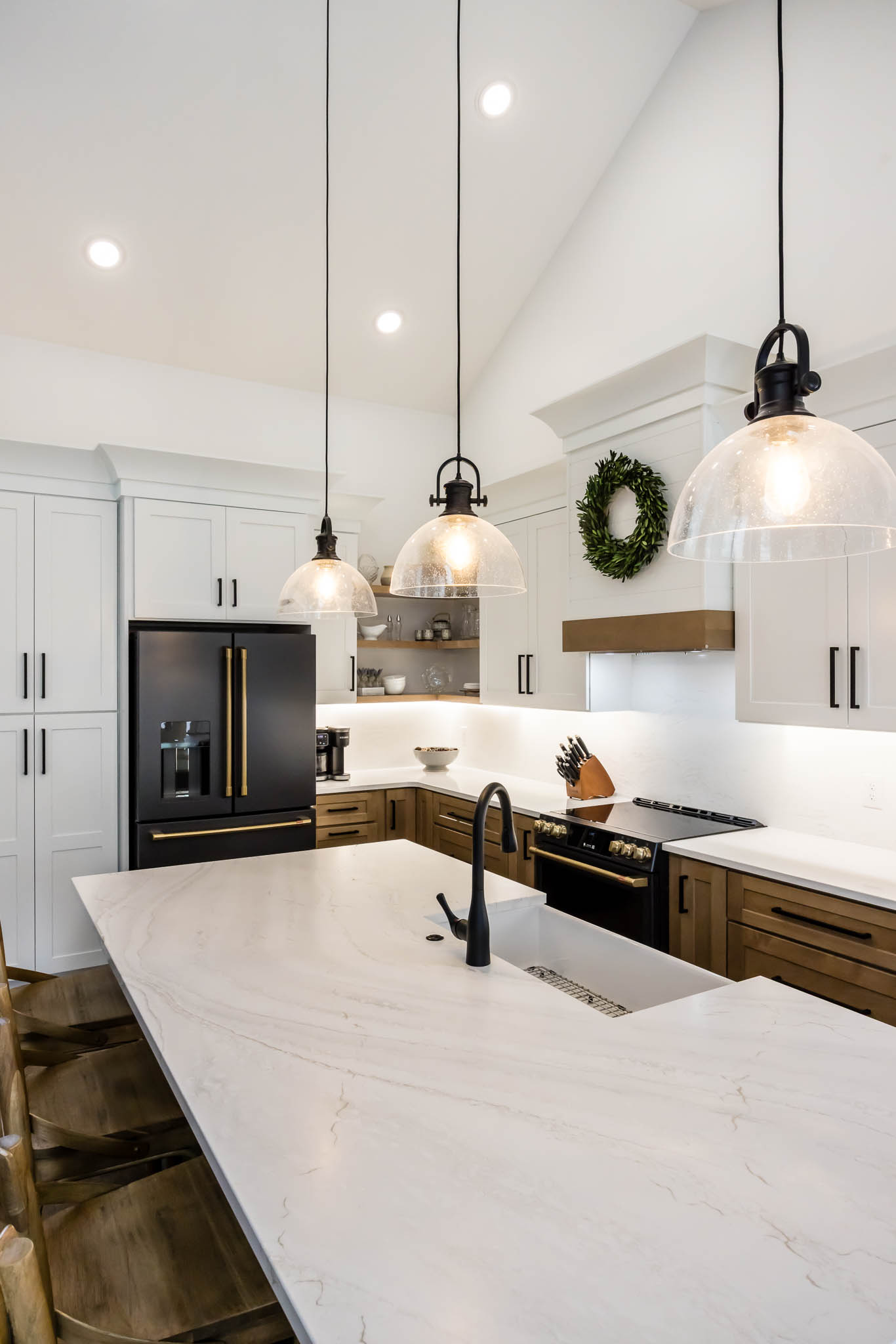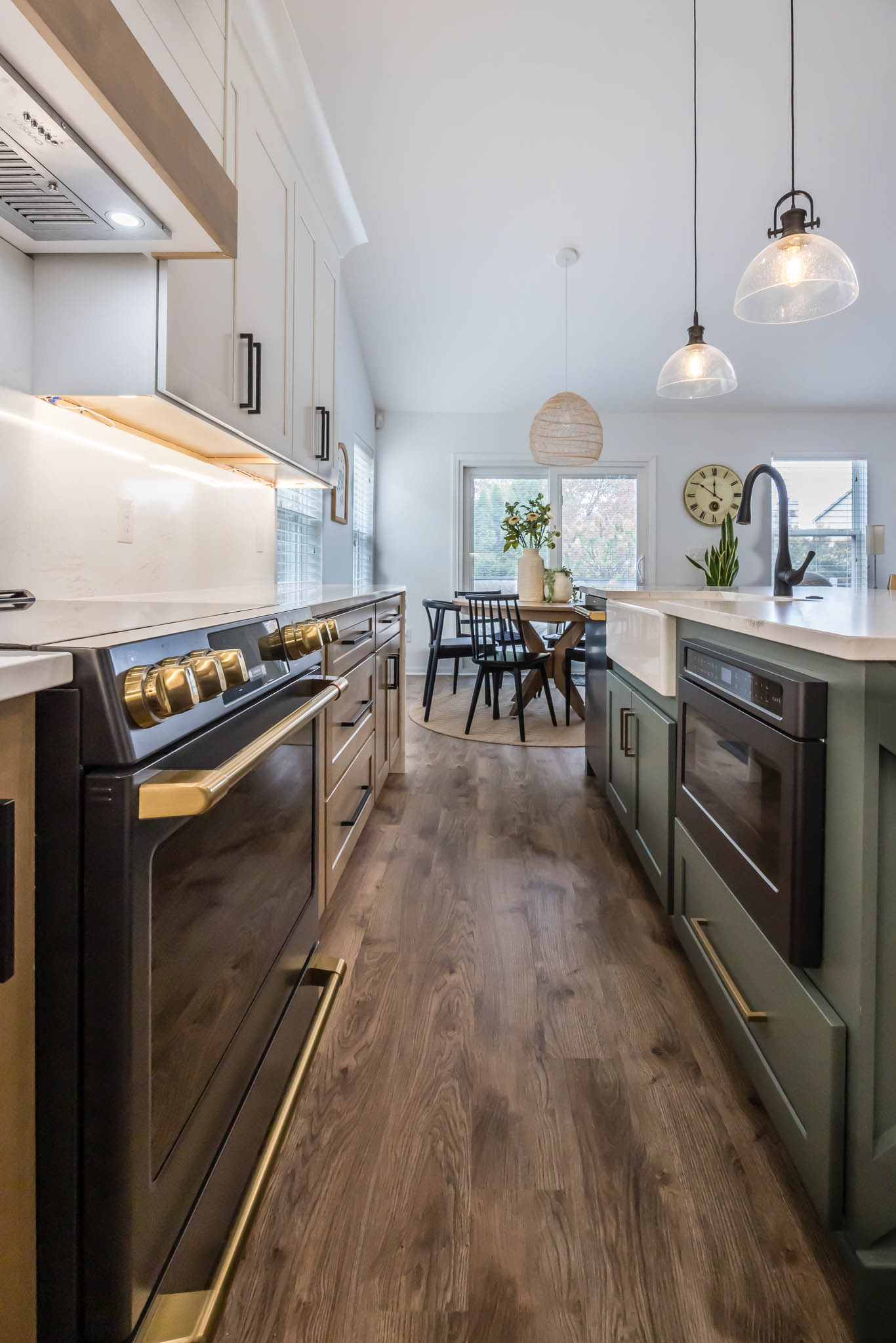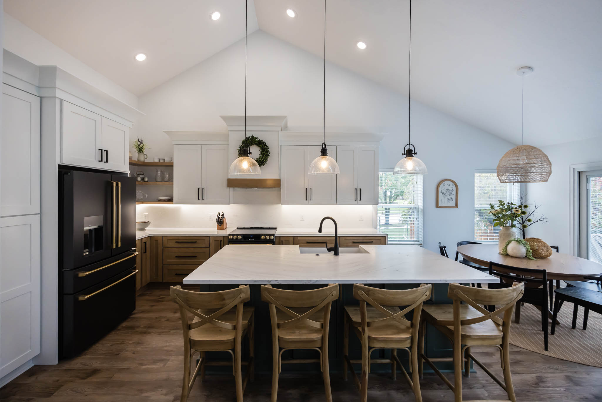 This kitchen was designed using modern color schemes, with a clean wood finish on the lower cabinetry, and then a a sleek smooth white on the uppers. The island is a teal color that pops, making the kitchen feel fun and exciting, but also sleek and modern.