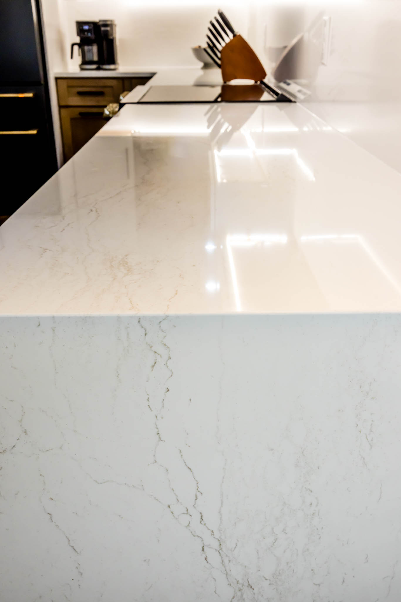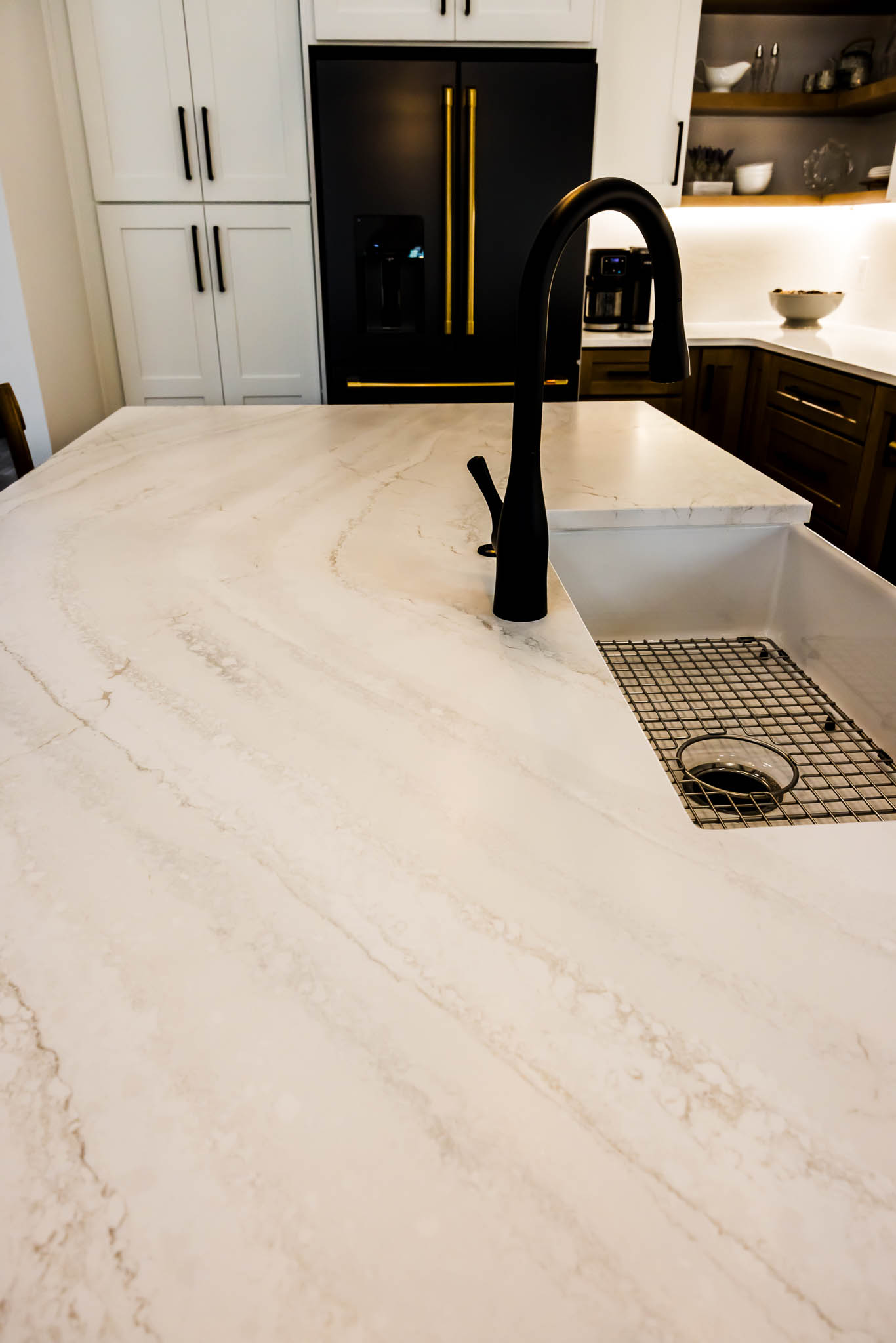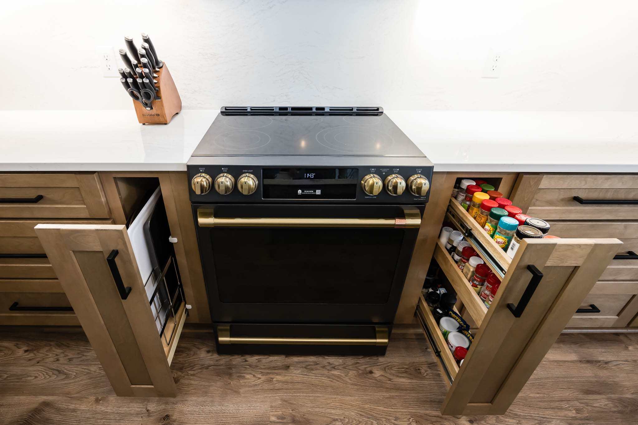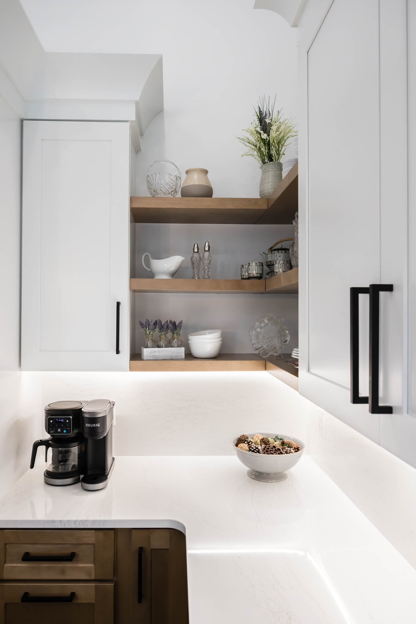 This kitchen was designed using modern color schemes, with a clean wood finish on the lower cabinetry, and then a a sleek smooth white on the uppers. The island is a teal color that pops, making the kitchen feel fun and exciting, but also sleek and modern.