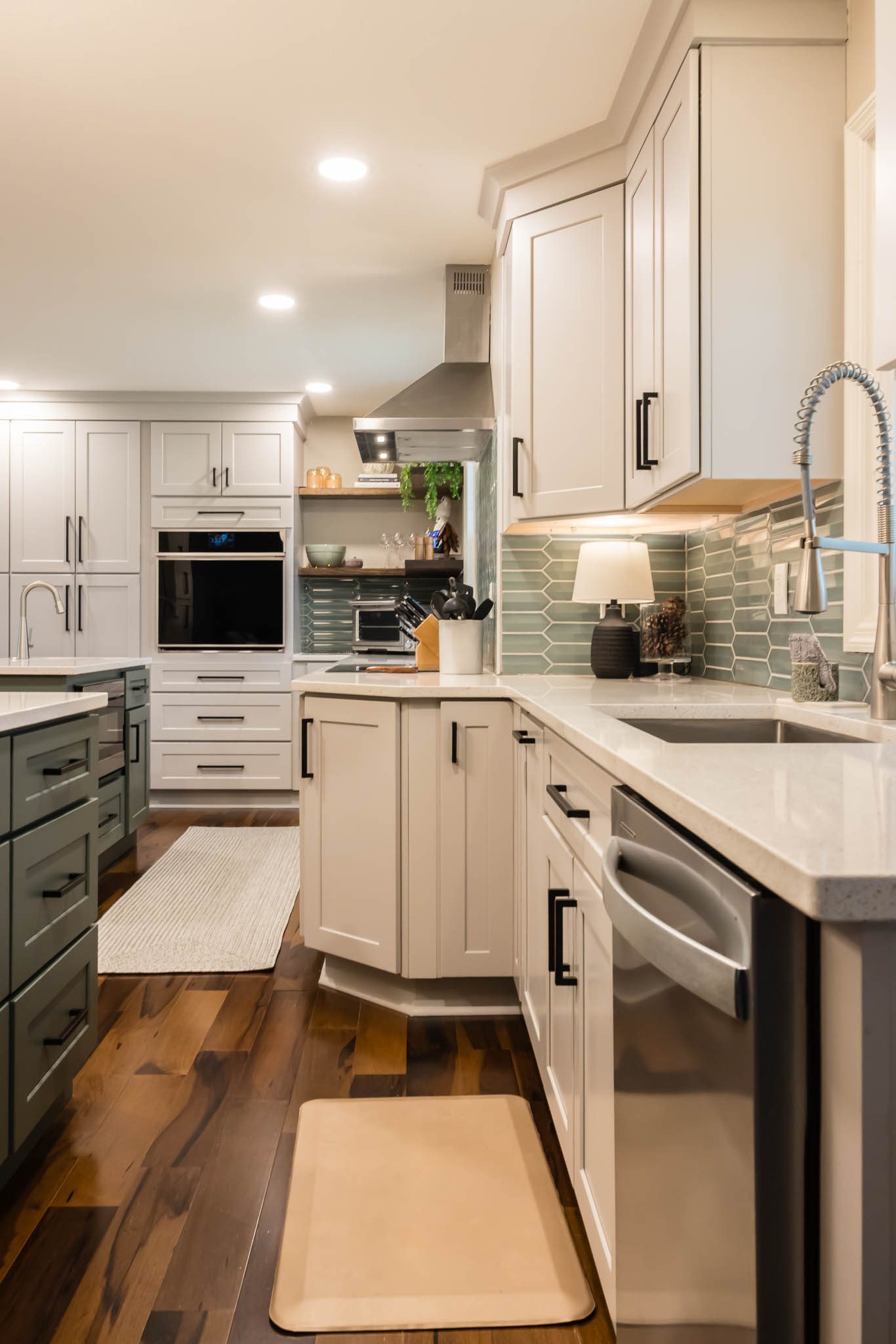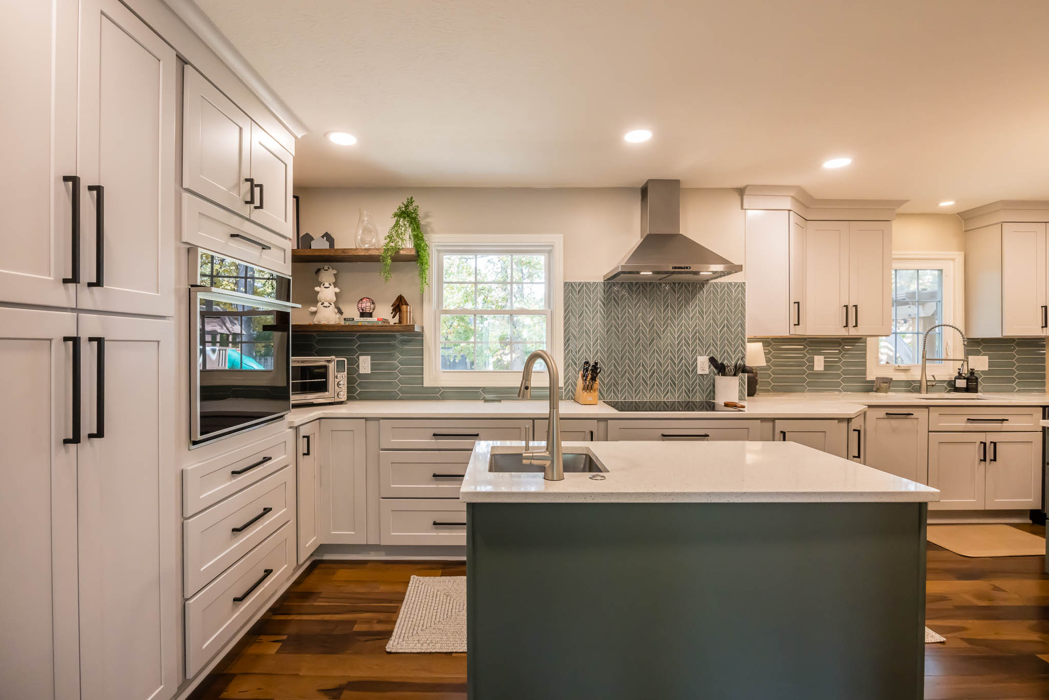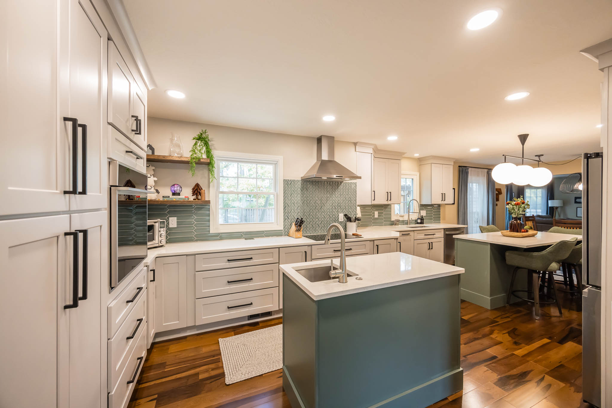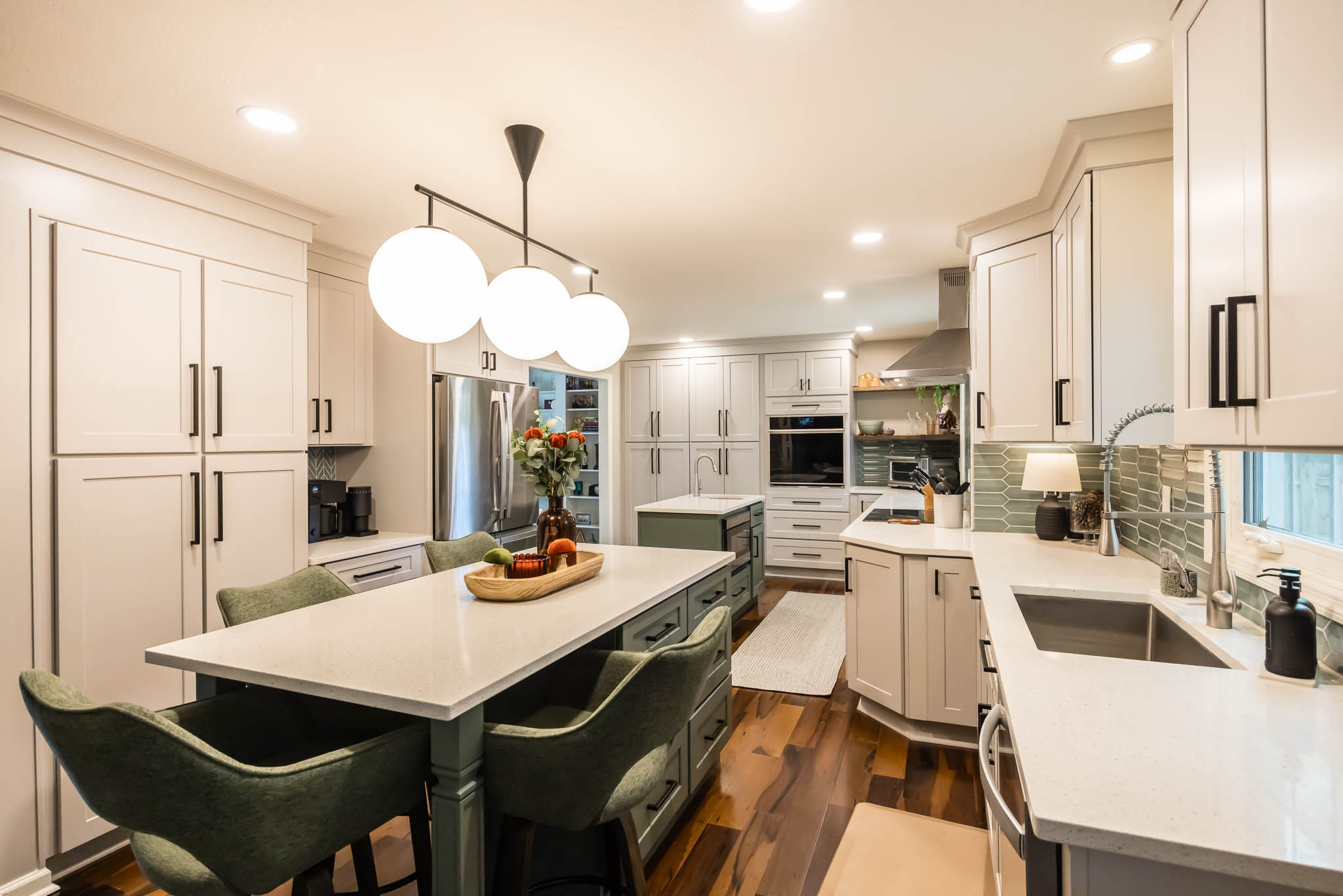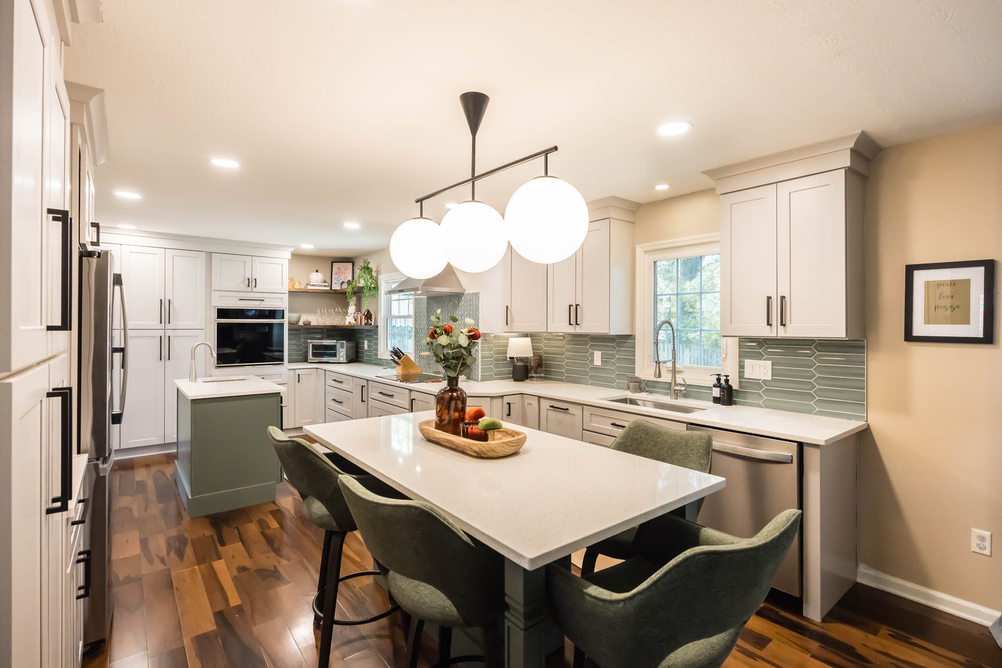 A Columbus kitchen that uses modern colors for its cabinetry, upper and lower cabinets are a white finish, while the island pops out with its green finish. This kitchen features double sinks, both stainless steel finishes.