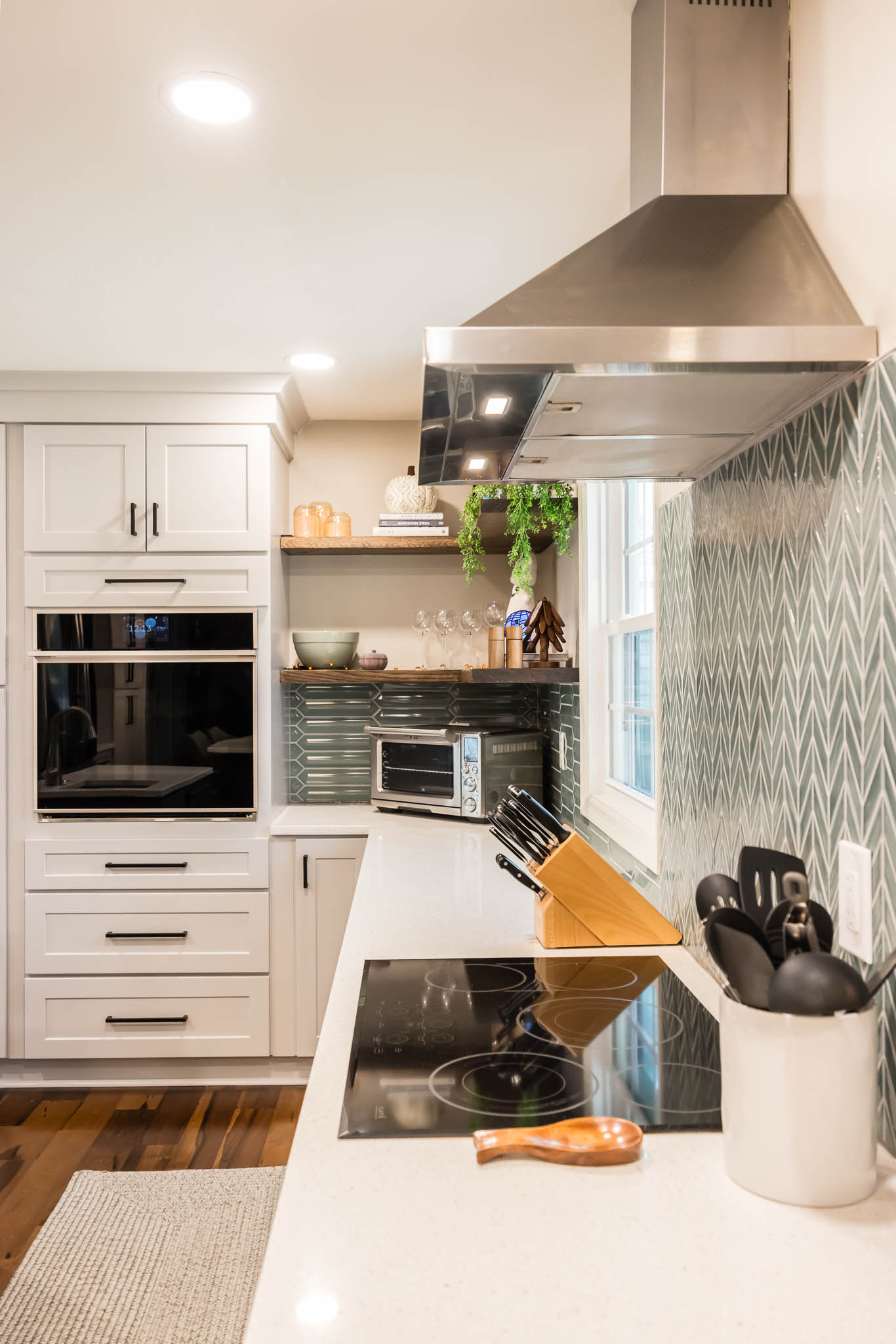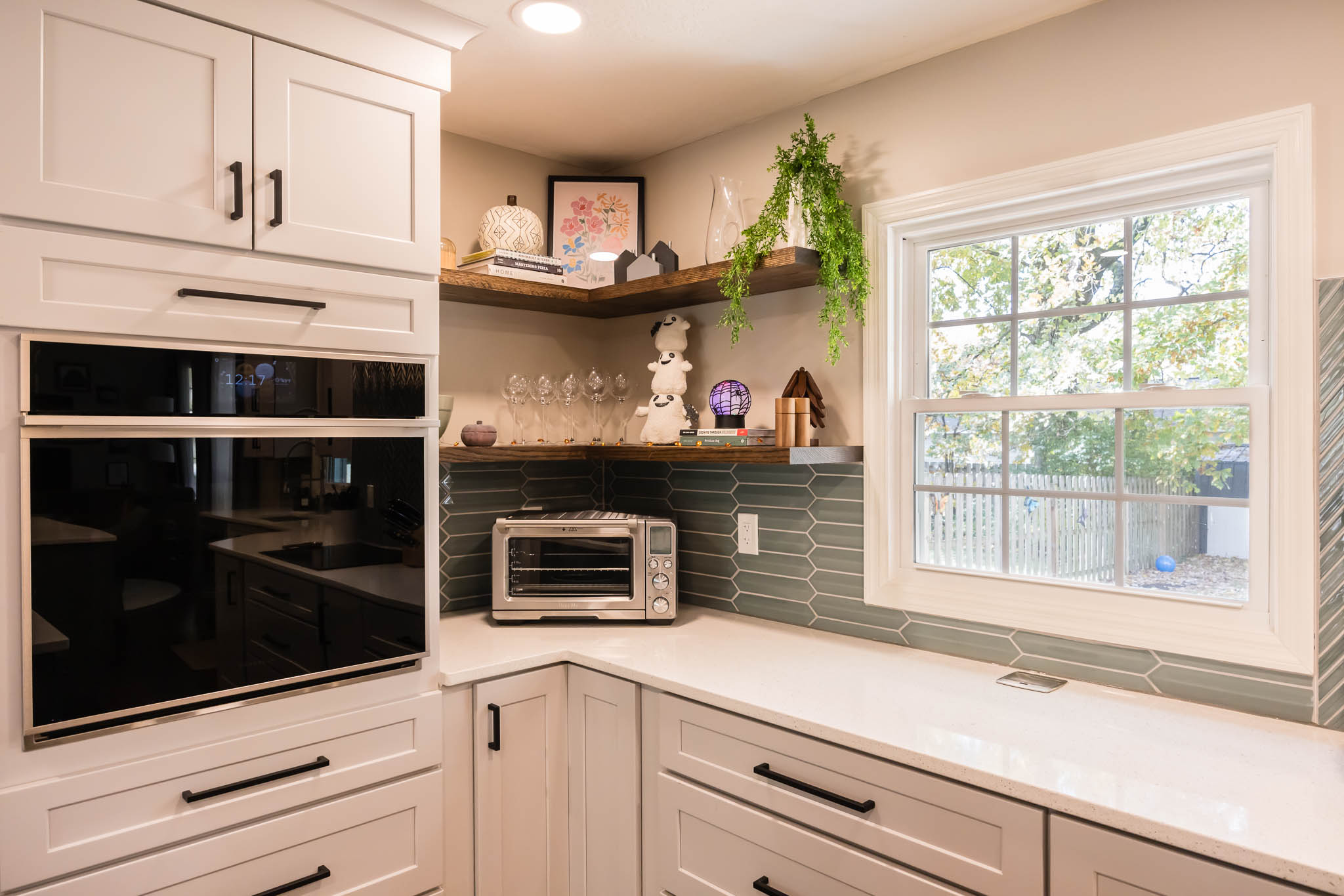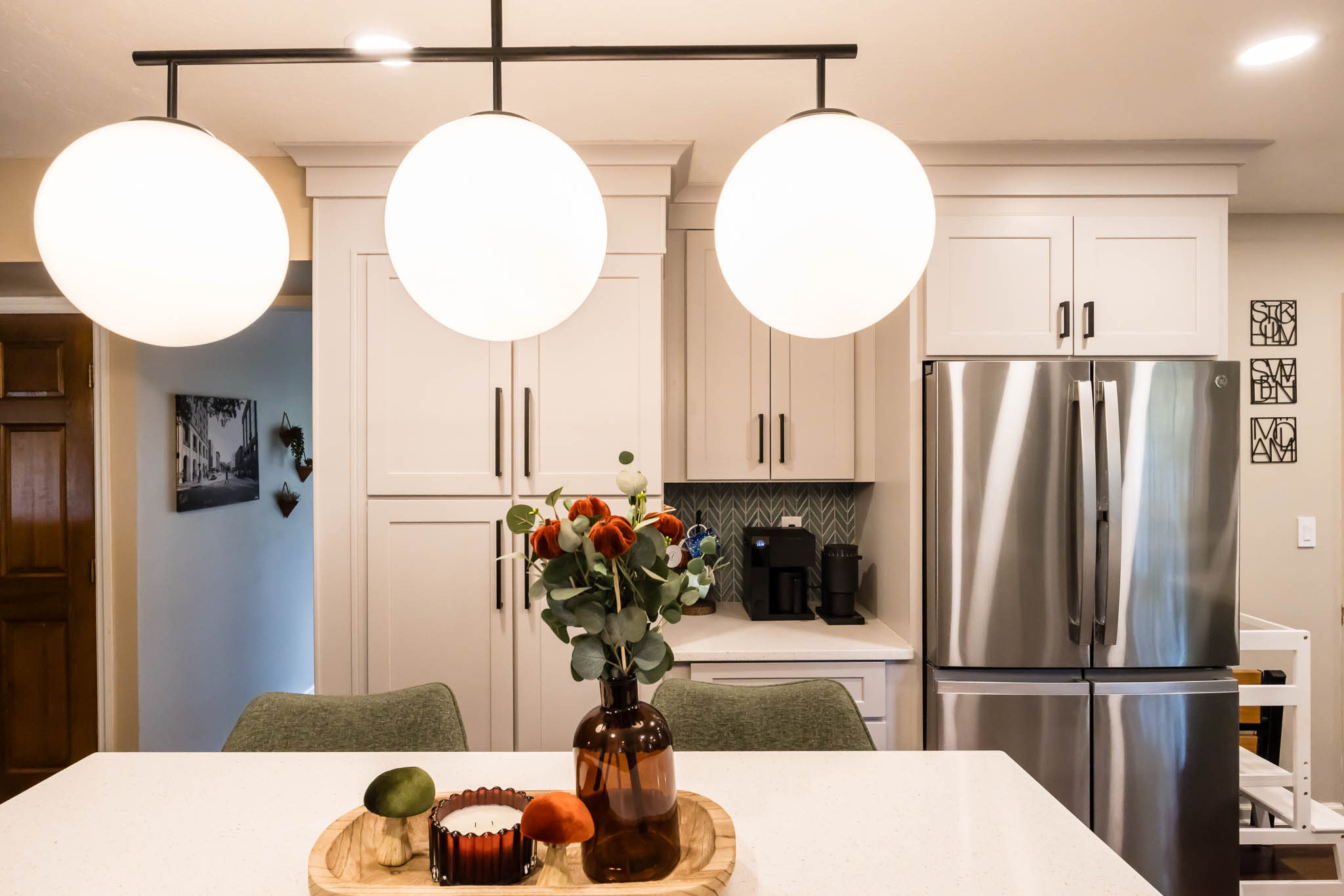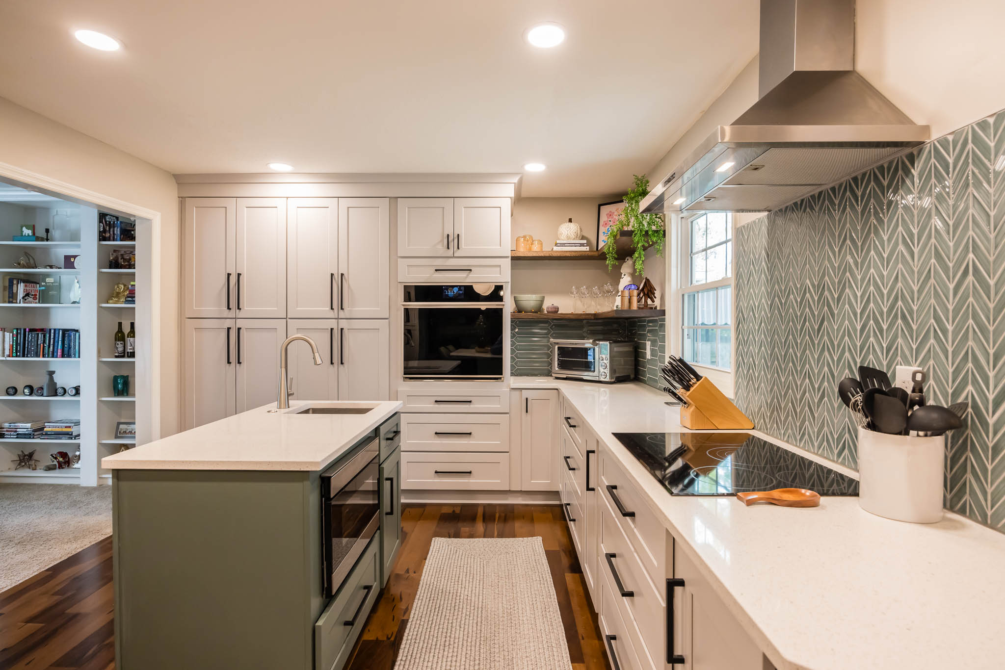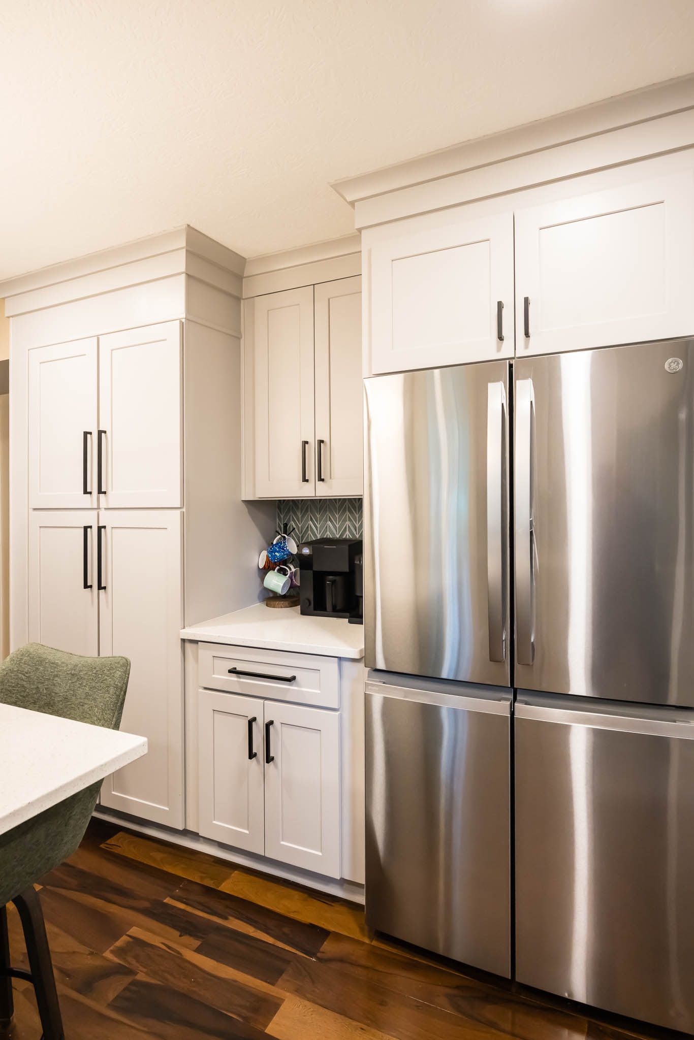 A Columbus kitchen that uses modern colors for its cabinetry, upper and lower cabinets are a white finish, while the island pops out with its green finish. This kitchen features double sinks, both stainless steel finishes.